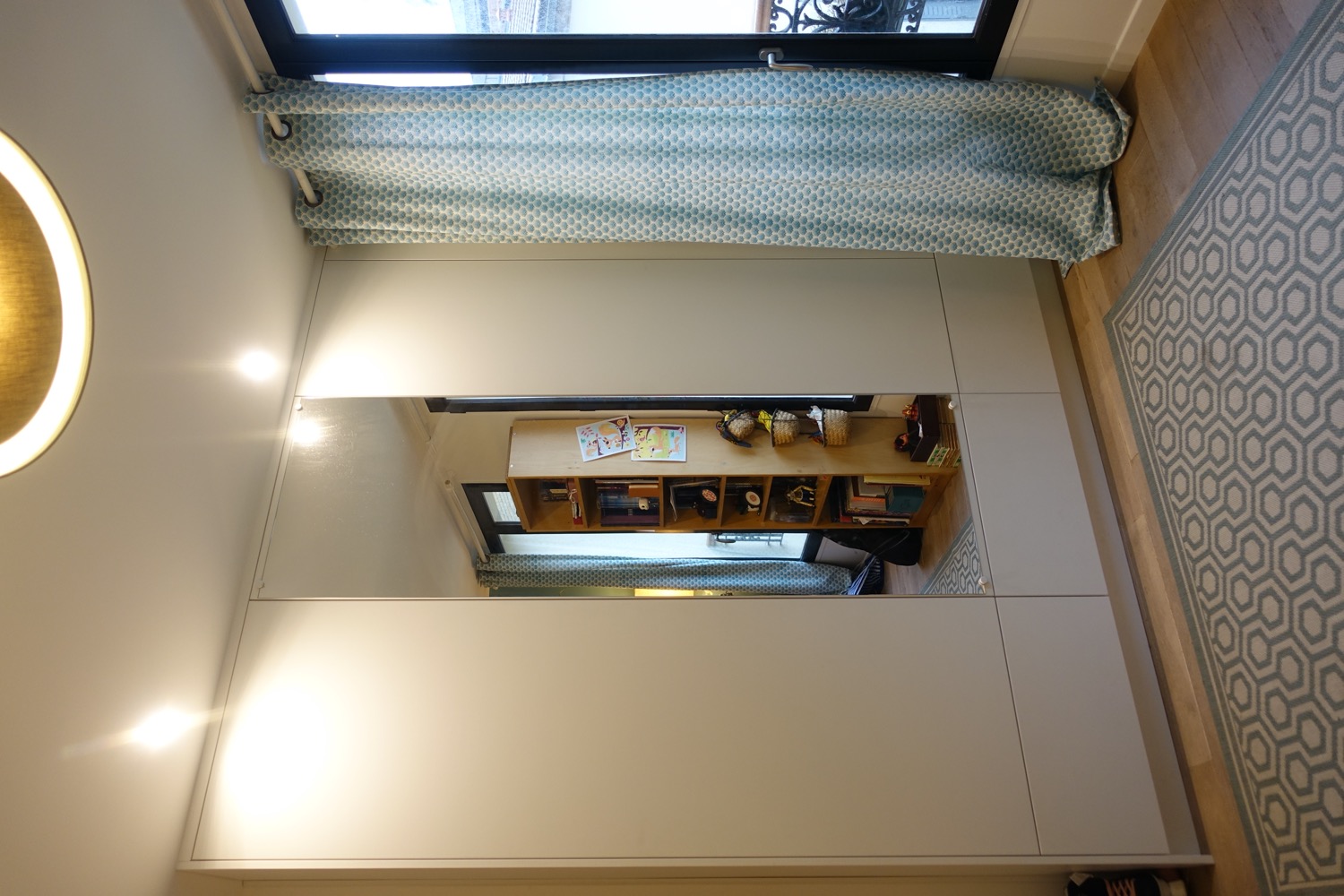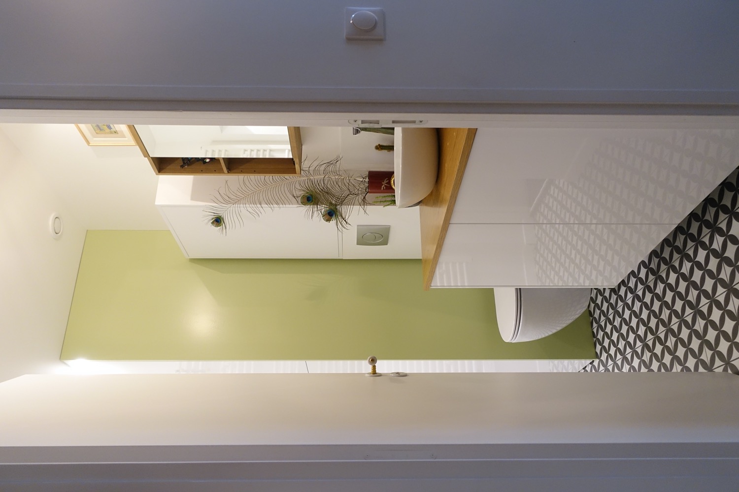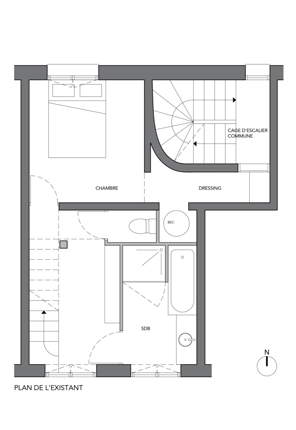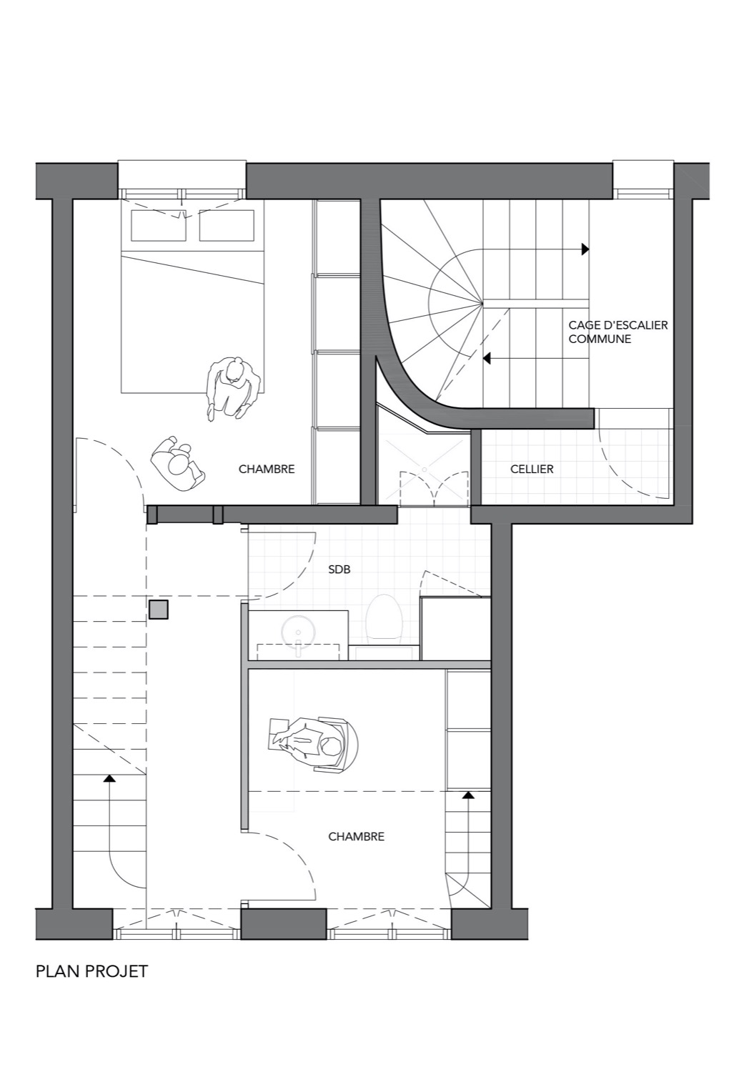 Programme | Dans ce duplex, il fallait réorganiser l’étage bas pour créer une nouvelle chambre en optimisant la salle de bain et le couloir. L’espace étroit et sous-exploité du dressing est devenu, grâce à la décondamnation de la porte palière existante, un cellier accessible depuis la cage d’escalier commune.