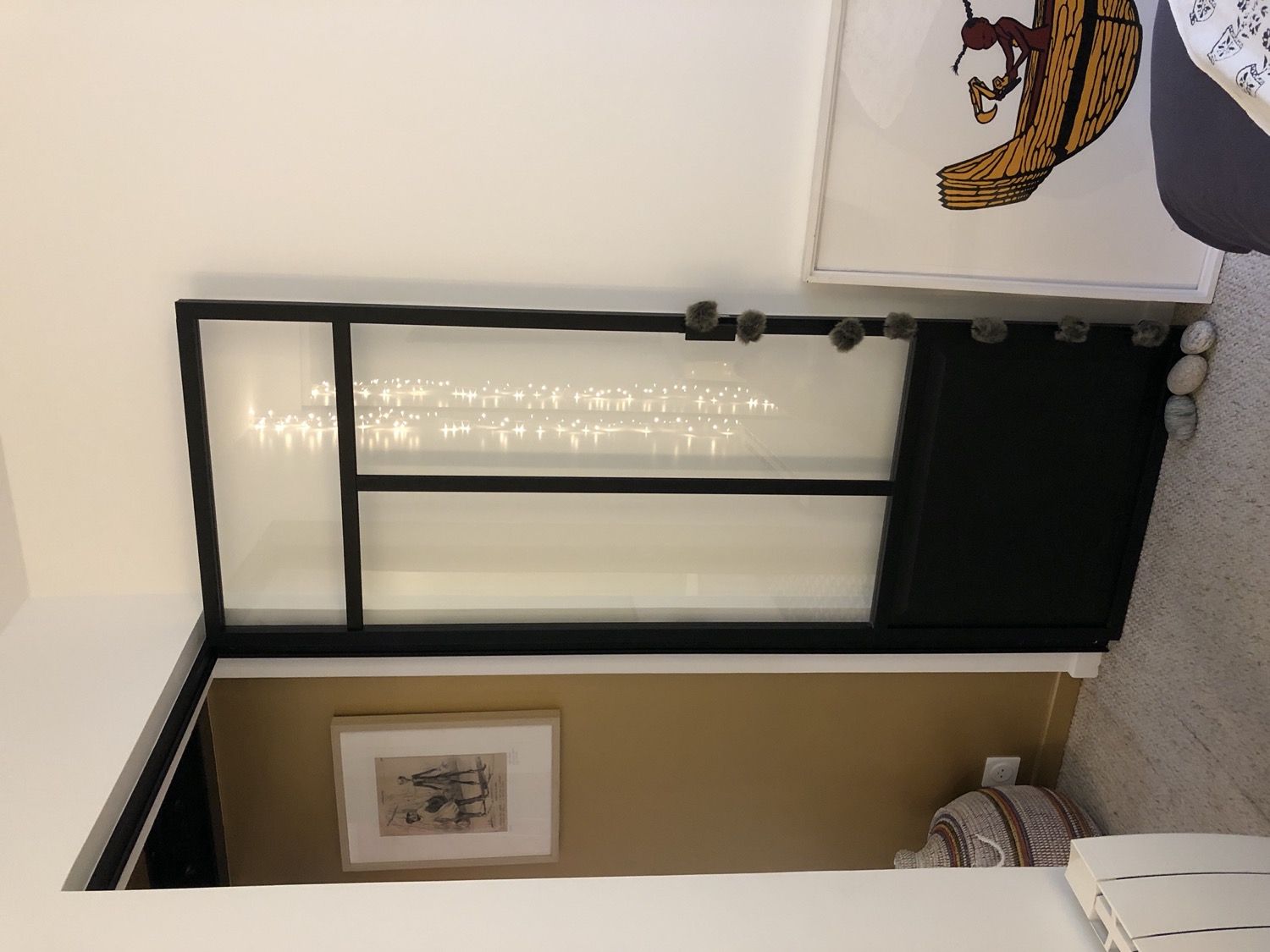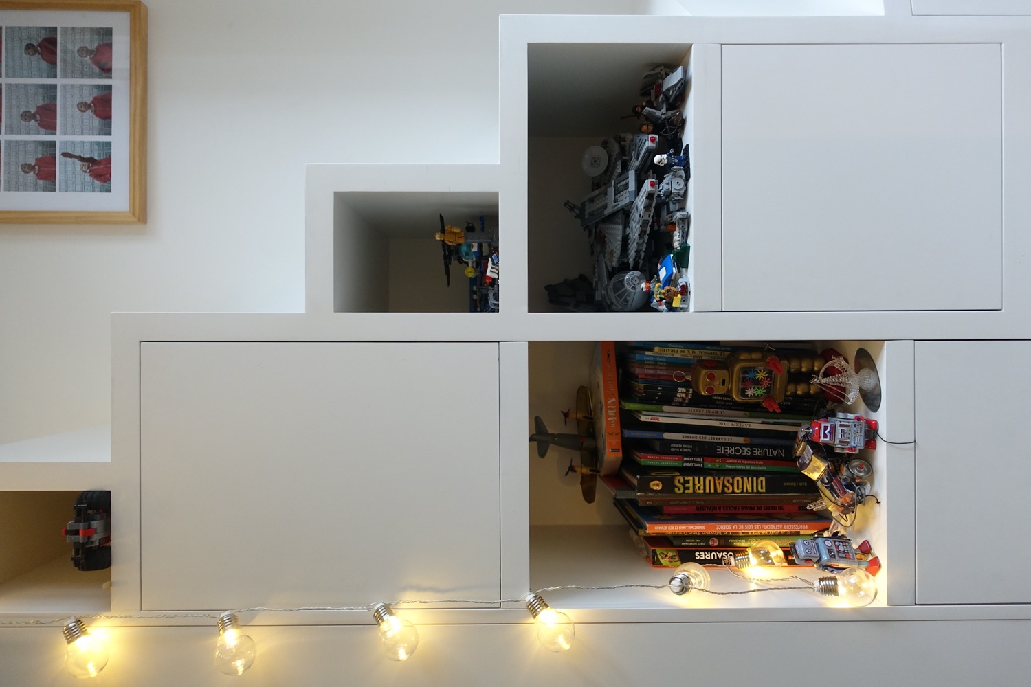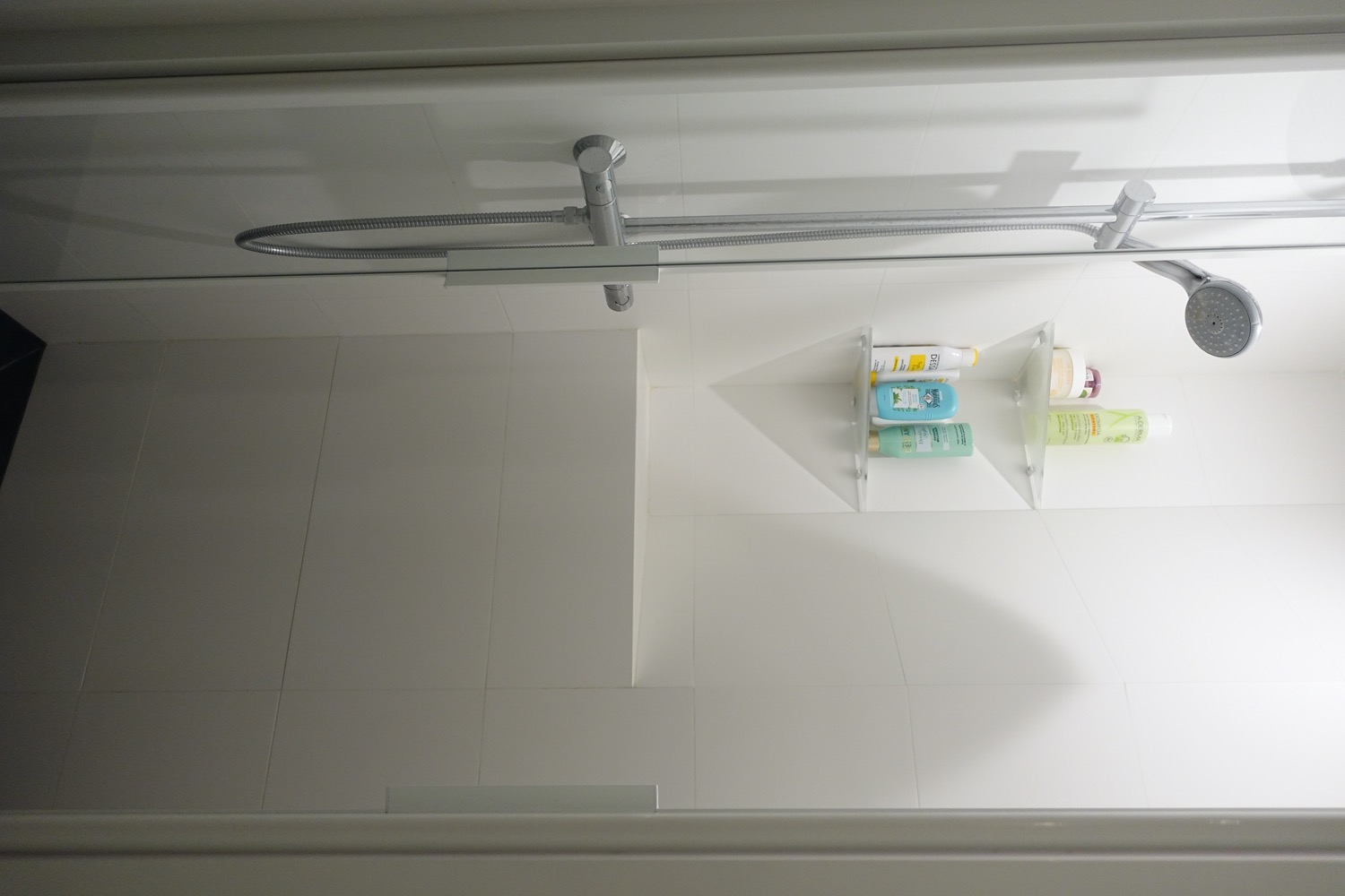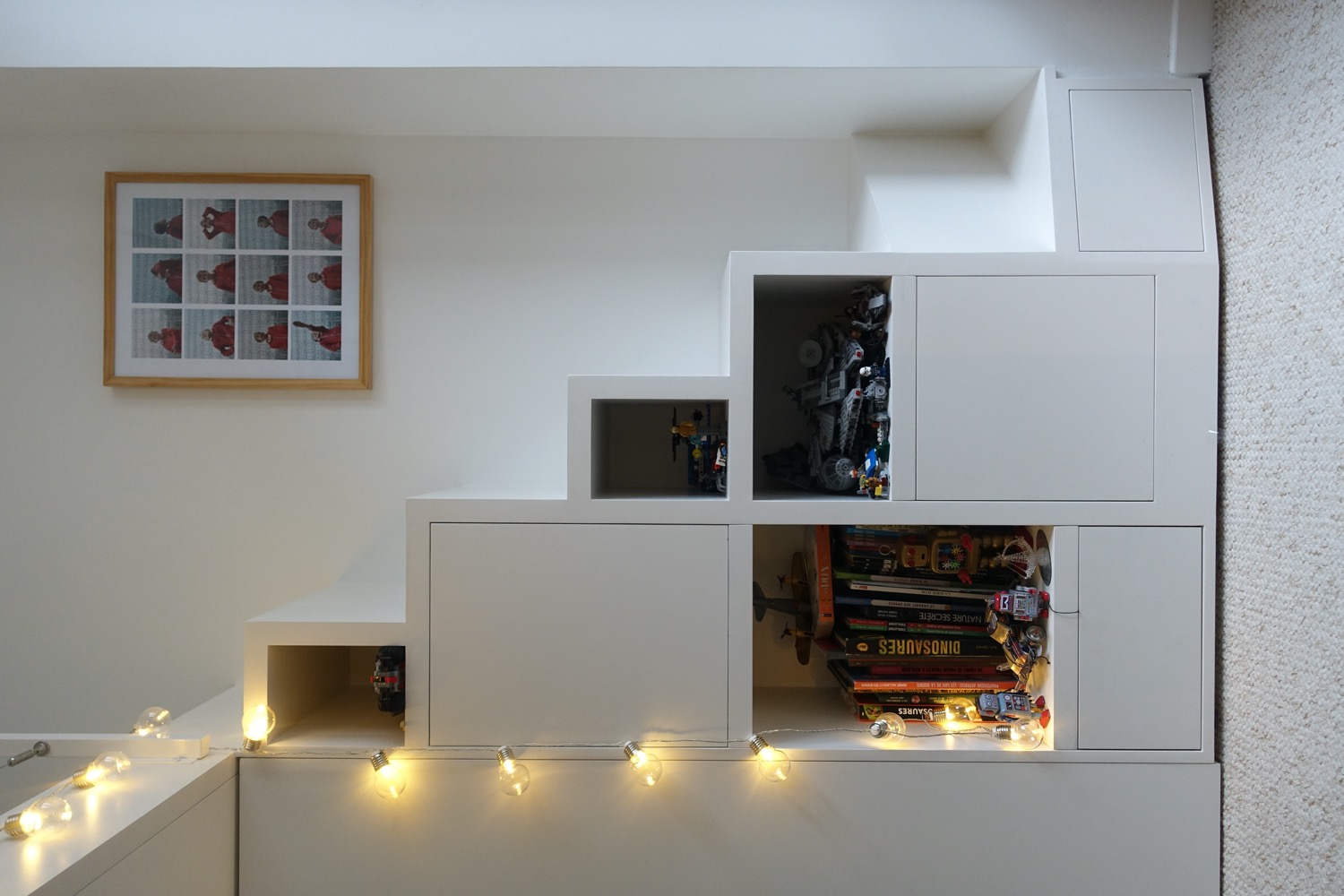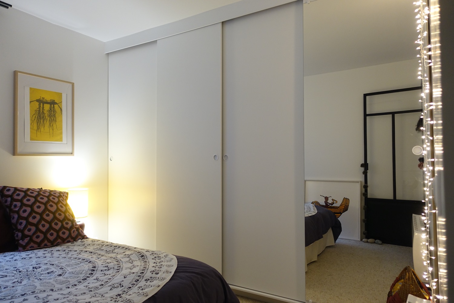 Programme | Dans ce duplex, il fallait réorganiser l’étage bas pour créer une nouvelle chambre en optimisant la salle de bain et le couloir. L’espace étroit et sous-exploité du dressing est devenu, grâce à la décondamnation de la porte palière existante, un cellier accessible depuis la cage d’escalier commune.