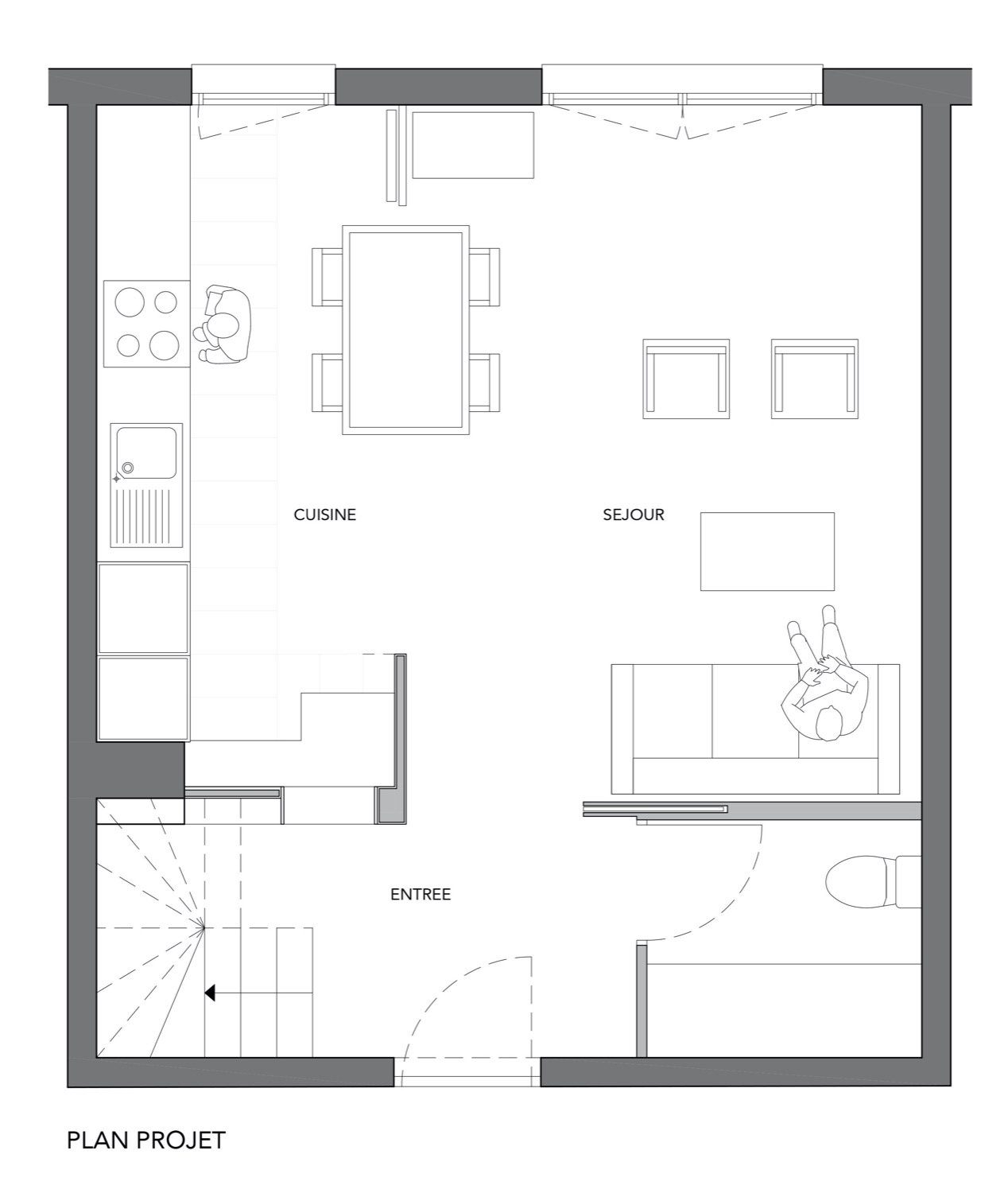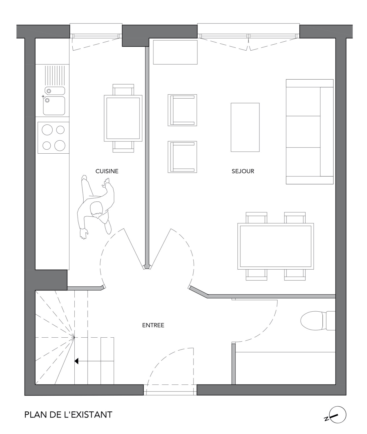 Programme | Une entrée trop grande, une cuisine en longueur et un séjour trop petit composent le rez-de-chaussée de ce duplex. La sensation d'espace est possible grâce à la dépose de la cloison entre la cuisine et le séjour et à la large porte coulissante pour accéder au séjour. Depuis l'entrée une ouverture cadre vers la cuisine et projette le regard vers l'extérieur.