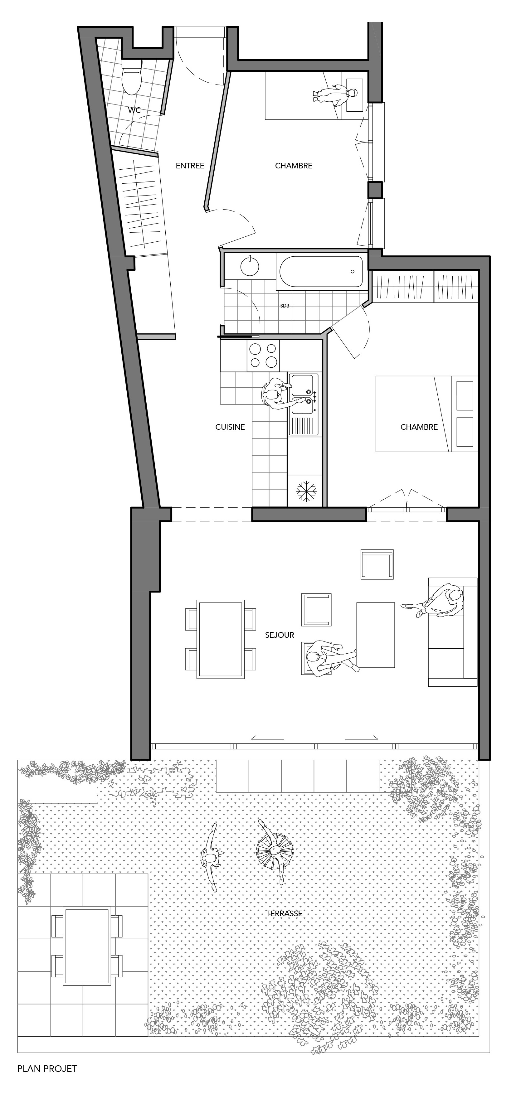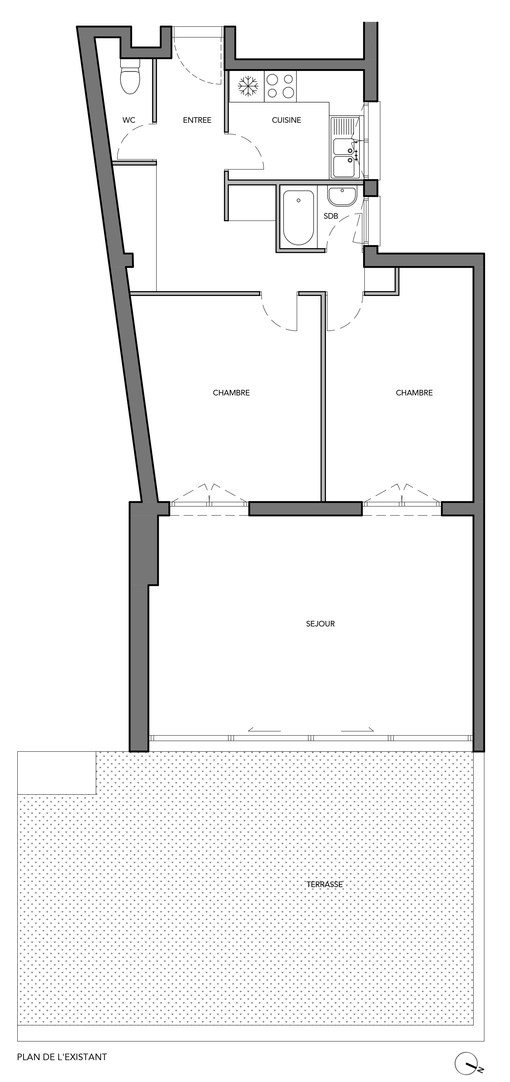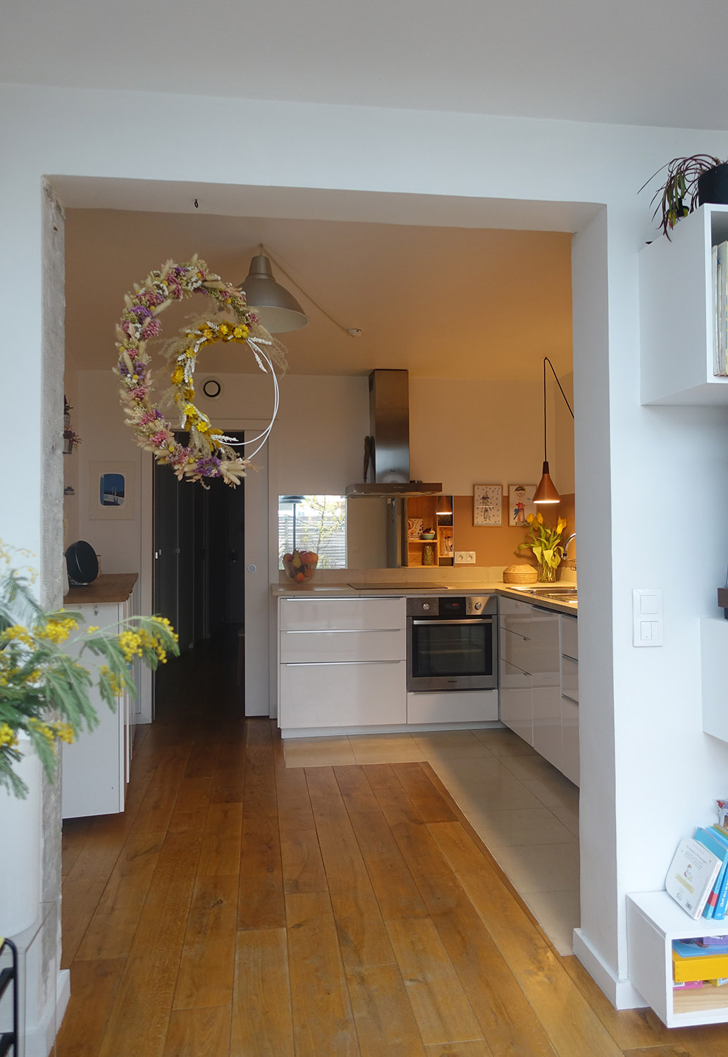 Programme | Cet appartement n'était plus habité depuis queslques années et tout était à y refaire. La nouvelle famille souhaitait une chambre d'enfant indépendante, créer une circulation plus fluide et rapprocher la cuisine du séjour.